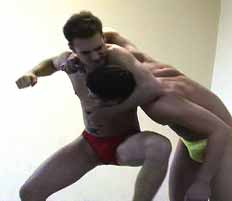 What a pose... Gemini traps Colin's left leg between his"," lifts Colin's right leg and low and behold there is a clear path to Colin's groin. |