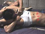 | Lot's of muscle on Steve too"," these guys look incredible. Sexy starts this one with a very long debilitating head scissors on Sean"," then he chokes Sean"," and then another head scissors. Sean though isn't up to loosing two in a row. He manages to match Steve's squeeze for a simultaneous headscissors. The punishment of Steve starts there"," after which he wraps his powerful arms around Steve for a sleeper to end this one. Steve looks great going down and Sean is pleased with himself as he humiliates the lifeless hunk. | |
